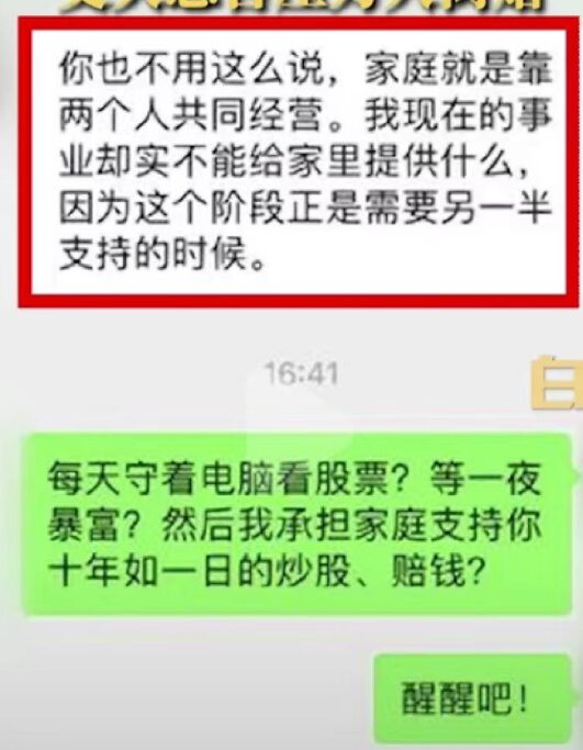 据爆料:四川成都的一名女子因怀孕生子,两年没有工作,据当事人周女士介绍,自己怀孕之前在某企业做培训讲师,月薪大概能有12000元左右,后来因为怀孕期间孕吐严重,所以就辞职了,家里的经济压力也变大了,2年多的时间里,夫妻一吵架就互相发牢骚。从丈夫发的聊天记录内容可以看出:丈夫对于周女士的成见很深,甚至还说出了别人怀孕生子一段时间就能正常上班了,质问妻子为何不行!而且还可以看出一点,周女士为了家庭能够多点收入,应当在炒股,但似乎是赔了钱。