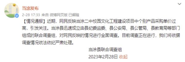 此前,安徽当涂县多名网友发帖称,“当涂二中一项中标金额488万元的采购项目中,出现了单价3600元的插线板和单价4000元的单灯控制器,两项总价19万元,采购疑似存在成本虚高、萝卜招标。”据封面新闻报道,从两款产品的厂家得到报价,上述同款产品单价均为200多元,插线板厂家销售员还称可以帮忙“虚报成本”。对此,当涂县联合调查组2月28日通报,近期,网民反映当涂二中校园文化工程建设项目中个别产品采购单价过高,引发关注。当涂县迅速成立由县纪委监委、县公安局、县公管局、县教育局等部门组成的联合调查组,对网民反映的情况进行全面调查。当涂县联合调查组表示,目前调查正在进行,将依据调查情况依法依纪严肃处理。
