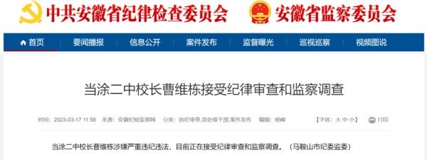 据安徽纪检监察网3月17日通报,当涂二中校长曹维栋涉嫌严重违纪违法,目前正在接受纪律审查和监察调查。