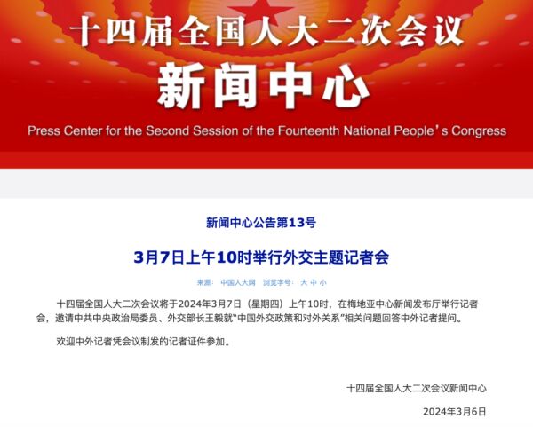 十四届全国人大二次会议将于2024年3月7日(星期四)上午10时,在梅地亚中心新闻发布厅举行记者会,邀请中共中央政治局委员、外交部长王毅就“中国外交政策和对外关系”相关问题回答中外记者提问。
