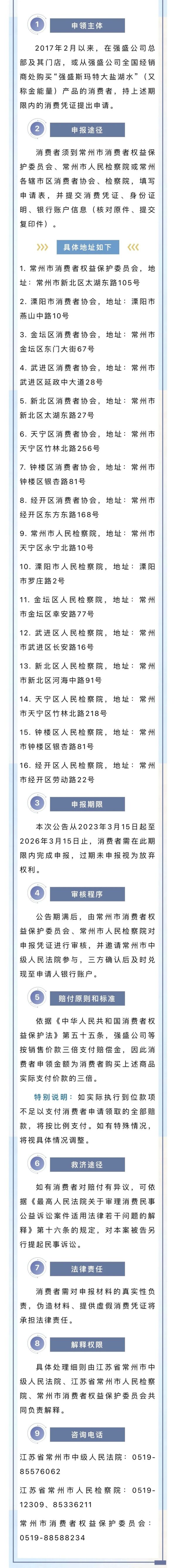 为切实维护消费者合法权益,保障公益赔偿金及时支付,根据《江苏省消费民事公益诉讼赔偿金管理暂行办法》《常州市消费维权公益诉讼退赔款项管理办法(试行)》等规定,正式启动消费者损害赔偿金申领程序,现公告如下: