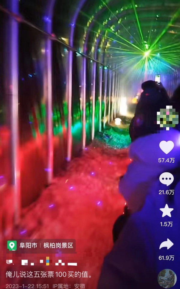 视频中,几名游客乘坐小火车进入标为“时空隧道”的大棚,棚内闪着七彩灯光,配有流苏挂件等简易装饰,半分钟左右便结束游玩。发布视频的网友配文称,“俺儿说这5张票花100块钱买得值。”