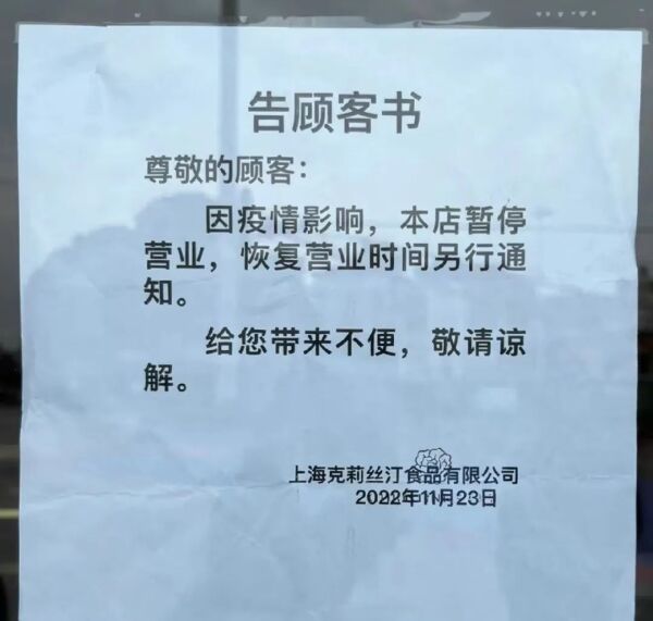 记者在小红书等平台看到,上海部分克莉丝汀门店曾于2022年11月贴出“告顾客书”,称“因疫情影响,本店暂停营业,恢复营业时间另行通知”。有网友同年12月发帖称,“店员跟我说总部原材料都发不了,蛋糕做不了,可以买点面包,面包卖完由于没有原材料也做不了了。”