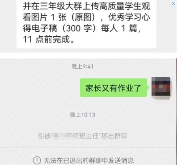 3月19日,据山东商报援引“沸点视频”报道,近日,在河南焦作,一名学生的父亲发视频称,因为在班级群内发了一句“家长又有作业了”被老师踢出群聊,引发广泛关注。