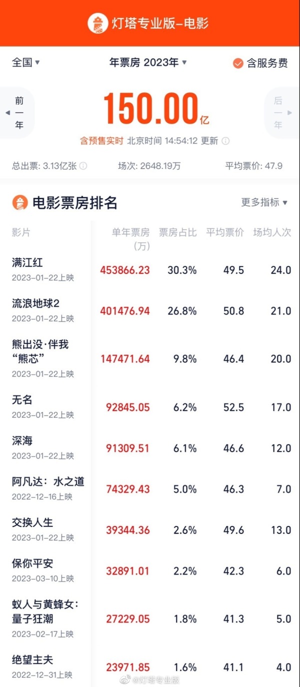 导读:截至3月19日14时54分,2023年度大盘票房突破150亿。《满江红》以45.39亿票房位列第一。