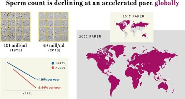 2022 年 11 月 15 日,以色列希伯来大学教授哈盖·莱文领导的研究团队在《人类生殖更新》期刊发表论文称,他们收集了 1973 年至 2018 年间在国际上公开发表的与男性精液质量相关的论文;