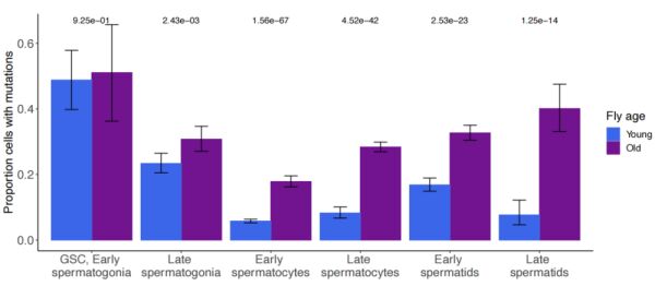 最终老年果蝇的精子细胞中有 40% 发生了突变,而年轻果蝇中的精子细胞中只有 8% 发生了突变。[1]