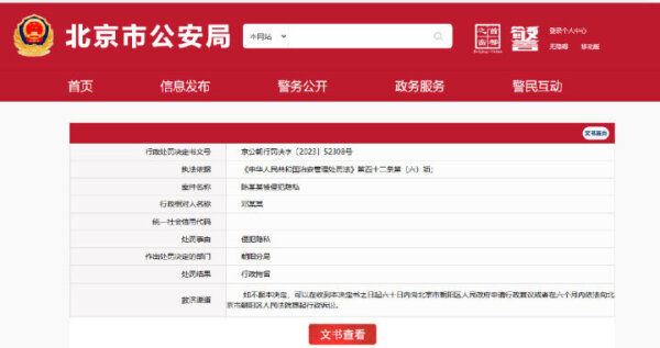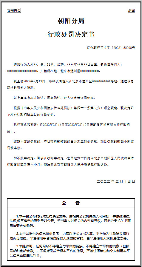 北京市公安局公开消息显示,北京31岁男子邓某某伙同他人在北京通州区通过信息网络散布陈某某个人隐私,被警方给予行政拘留5日的行政处罚。