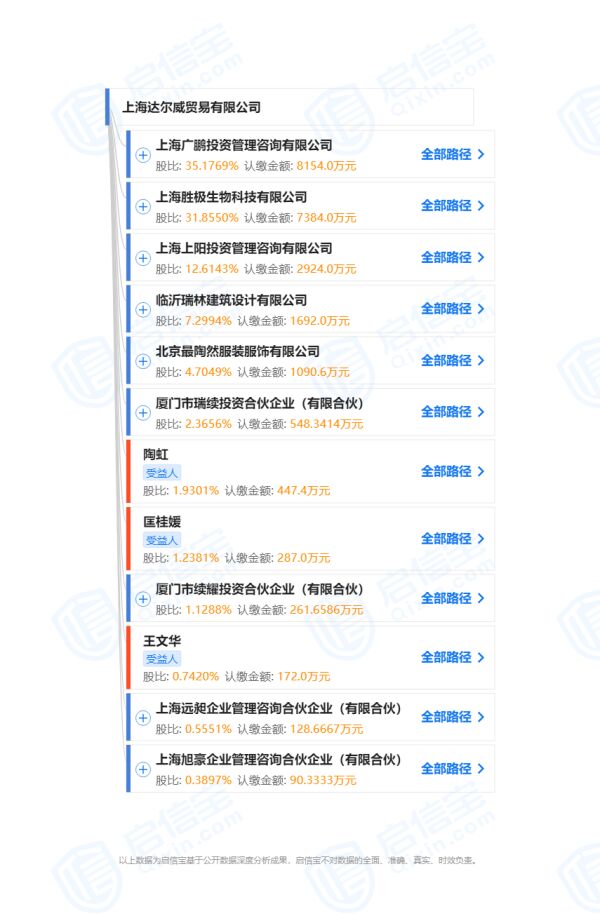 据启信宝,上海达尔威贸易有限公司成立于2013年6月,注册资本为2.3亿元,法定代表人是林吉荣(即知名演员林瑞阳),企业性质为有限责任公司(外商投资企业与内资合资) 。目前,达尔威主营业务包括,从事货物及技术的进出口业务,化妆品、针纺织品、服装鞋帽、办公用品、日用百货等。