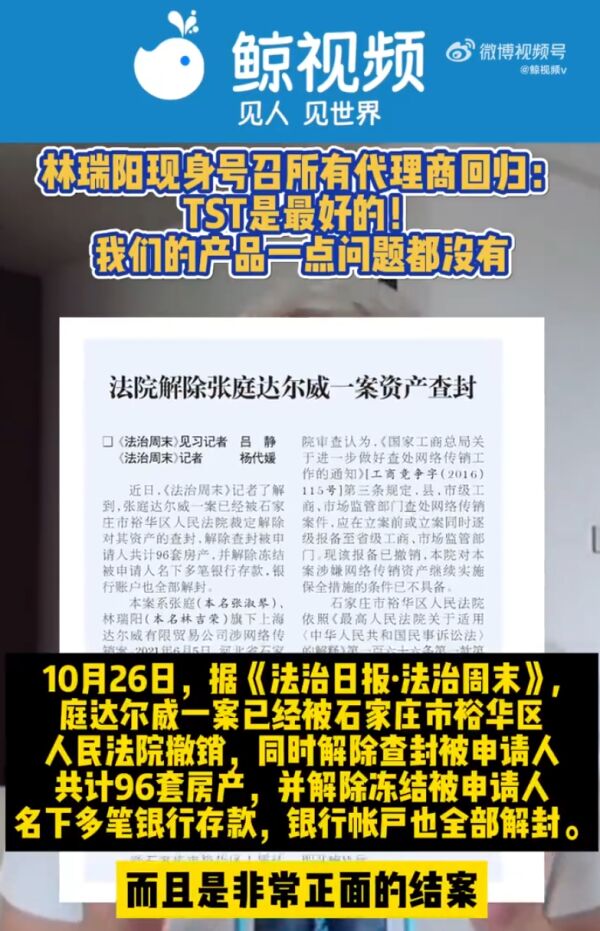10月26日,据《法治日报·法治周末》报道,张庭(张淑琴)、林瑞阳(林吉荣)夫妇创办的品牌TST庭秘密因涉嫌传销,相关公司名下的96套房产曾被冻结。日前,这96套房产的查封被解除。