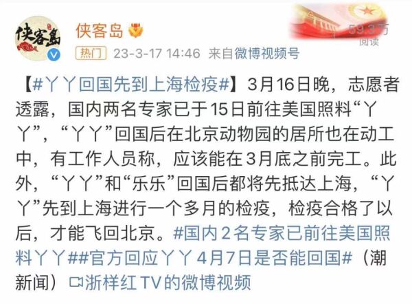 对于“丫丫”4月7日是否能回国,北京市公园管理中心工作人员称不能确定,“因为合同是4月7日到期,但是具体的回国手续依然在公示和办理中”。此外,“丫丫”和“乐乐”回国后都将先抵达上海,“‘丫丫’先到上海进行一个多月的检疫,检疫合格了以后才能飞回来(北京)。”