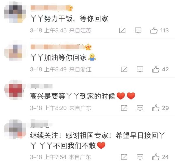 得知“丫丫”近况,有网友留言:“丫丫”努力干饭、等你回家、希望早日接回“丫丫”。