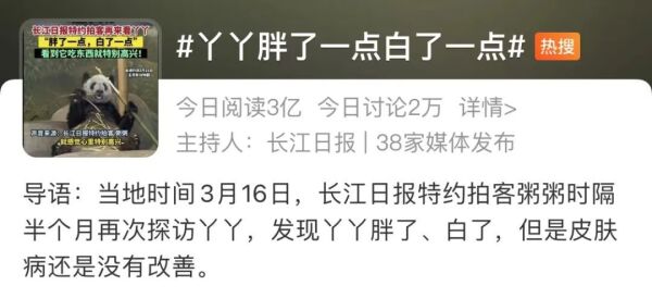 近日,#“丫丫”胖了一点白了一点#话题,冲上热搜第一,阅读次数已超过3.2亿。