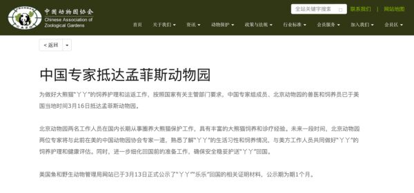 据中国动物园协会网站消息,为做好大熊猫“丫丫”的饲养护理和运返工作,按照国家有关主管部门要求,中国专家组成员、北京动物园的兽医和饲养员已于美国当地时间3月16日抵达孟菲斯动物园。