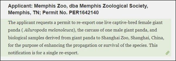 3月13日,旅美大熊猫“丫丫”和“乐乐”的进出口许可证申请信息在美国的《联邦公报》Federal Register官网正式公示。文件显示,“申请人申请将一只圈养繁殖的雌性大熊猫,一只雄性大熊猫的遗体,及大熊猫身体提取的生物样本转交到中国的动物园,以促进该物种的繁殖或生存。”公示期于3月13日正式开始,为期31天,截至4月12日。公示期结束后,美国鱼类及野生动物管理局(USFWS)将发放许可证。