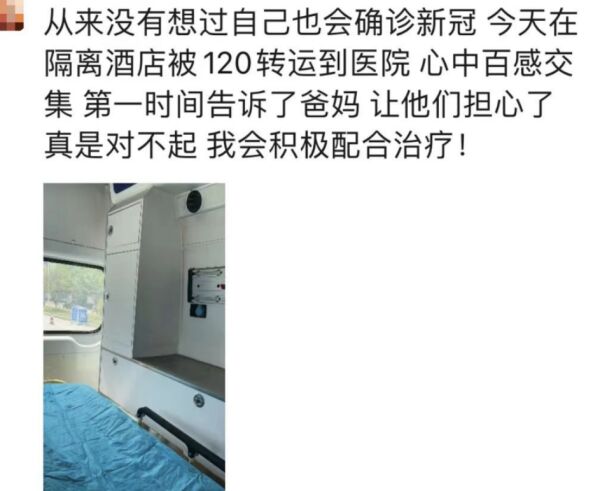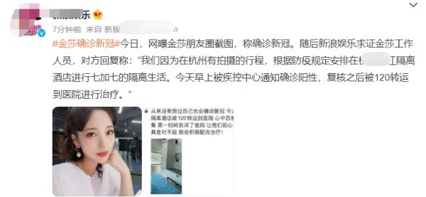 同时,金莎本人的朋友圈动态也在第一时间被曝光,她本人发文表示自己也没有想到会确诊,本来是在酒店隔离,但现在已经通过乘坐救护车转到了医院,她在第一时间把状况告诉了家人,接下来她会积极配合治疗。
