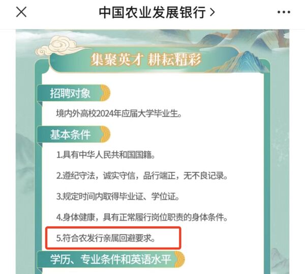 农发行2024年度校园招聘写明“须符合农发行亲属回避要求”。