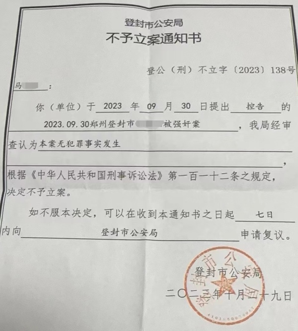 10月29日,登封市公安局向马玲下达《不予立案通知书》。该通知书显示,马玲控告的其女儿被强奸一案,该局经审查认为,“本案无犯罪事实发生”,决定不予立案。