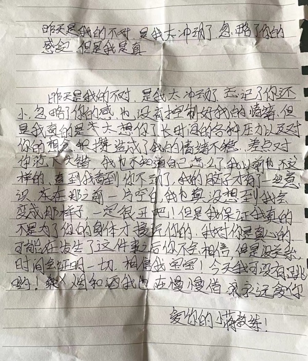 “昨天是我的不对,是我太冲动了,忘记了你还小,忽略了你的感受,也没有控制好我的情绪……”这封手书的信还写道:“我也真没想到我会变成那样子,一定很丑吧!但是我保证我真的不是为了你的身体才接近你,我对你是真心的……”