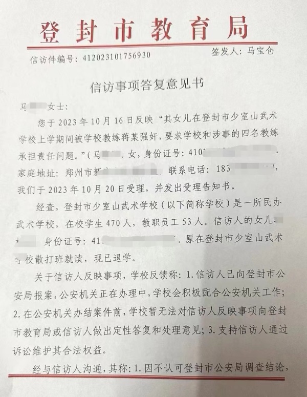 登封市教育局在2023年11月曾书面回复马玲:少室山武术学校反馈称,学校会积极配合公安机关工作,在案件办结之前,学校暂无法作出定性答复和处理意见。