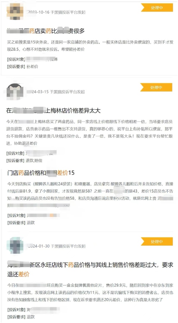 从投诉详情和诉求来看,购药的消费者能接受一定的价差,但面对成倍的价差,有种“成了冤大头”的不良体验。尤其是对于线下药店和自家线上销售平台有价差的情况,有消费者认为,线下药店销售人员应该告知消费者这一情况。也有消费者担心,价格更低的药品能否保证产品质量,作为购买者感到迷茫。