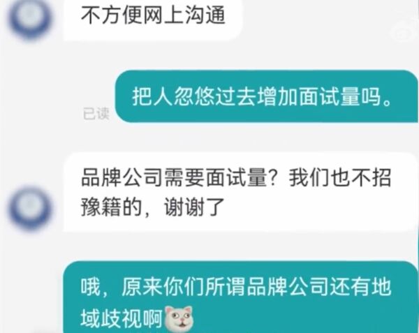 而在女子向对方询问是不是忽悠应聘者前去增加面试量时,对方态度发生了大转弯,明确回复道,“品牌公司需要面试量?我们也不招豫籍的。”