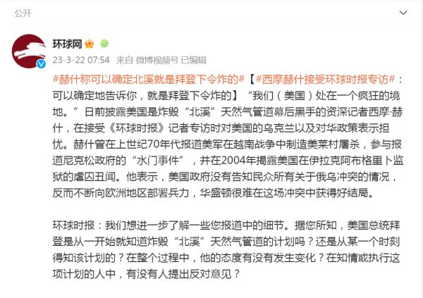 导读:3月22日,曾披露美国是炸毁“北溪”天然气管道幕后黑手的资深记者西摩·赫什,在接受记者专访时表示:可以确定,“北溪”天然气管道是拜登下令炸毁的。