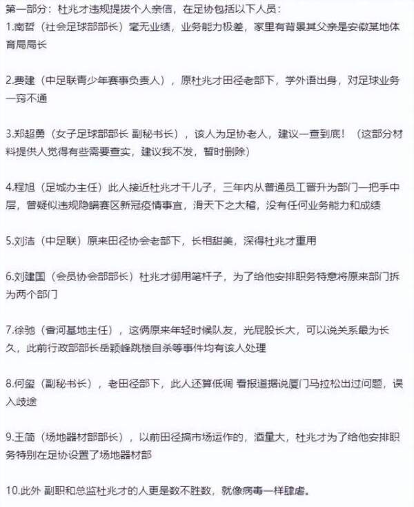 现在冉雄飞继续在发文,揭露中国足协黑料,这次将矛头指向了杜兆才,爆料杜兆才违规提拔个人亲信,几乎在所有足协部门都安插了自己的人,这些人大多不懂球,没有任何足球行业管理经验和业务能力,从列出的具体名字和职位来看,总共9人,后面没有一一点名,说明不止这个数字。