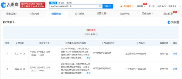 另一家涉事公司海南贝壳汽车租赁有限公司成立于2021年4月,法定代表人为王腾,注册资本200万人民币,由王腾全资持股。2021年年报显示,该公司实缴资本同样为0,从业人数为1,但参保人数为0。风险信息显示,该公司2次因未按规定办理小微型客车租赁车辆备案,被三亚市综合行政执法局处罚,合计被罚款8千元。
