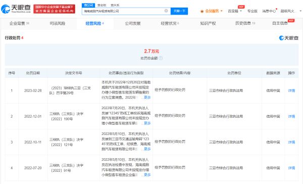 记者从天眼查App获悉,其中一家涉事公司海南威捌汽车租赁有限公司成立于2020年12月,法定代表人为沈恒,注册资本200万人民币,由沈恒全资持股。2021年年报显示,该公司实缴资本为0。此外,风险信息显示,该公司曾多次因未按规定办理小微型客车租赁车辆备案,被三亚市综合行政执法局处罚,合计被罚款2.7万元。