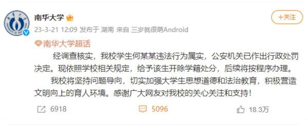 这两天,南华大学男生何某某编造女同学谣言、P不雅图片牟利事件,引发舆论高度关注。21日,南华大学称,经调查核实,该校学生何某某违法行为属实,公安机关已作出行政处罚决定。现依照学校相关规定,给予该生开除学籍处分。