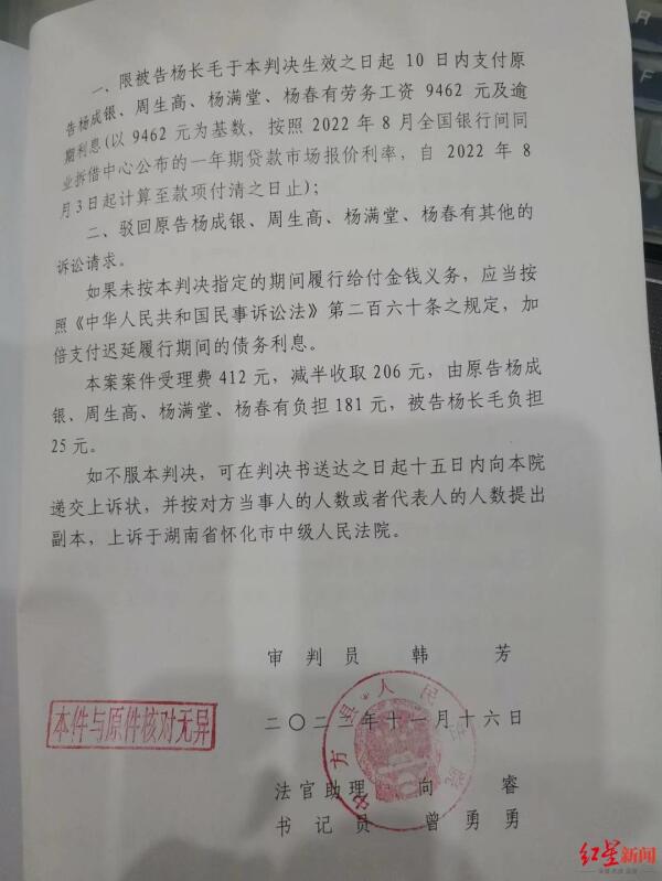 另一名原告、当时跟着杨成银去给杨长毛做工的周生高也向红星新闻表示,杨长毛把他们几人的电话都拉黑了,而且不接陌生来电。他自己也去找杨长毛好几次,“有一次都找到了人了,他让我等一下,随后就找不见他了。”