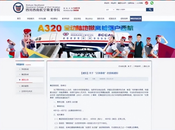 四川西南航空职业学院官网发布了《关于“泛美春假”的放假通知》,通知安排全校师生4月1日至7日放7天春假(含清明放假时间)。