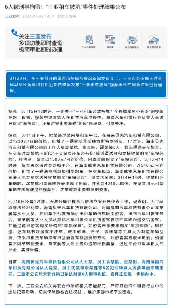 目前,海南贝壳汽车租赁有限公司法人王某、员工袁某航、张某阳,海南威捌汽车租赁有限公司法人沈某、员工沈某和李某鑫等6名犯罪嫌疑人因涉嫌敲诈勒索罪,三亚市公安局天涯分局已依法对该6人刑事拘留。案件正在进一步侦办中。