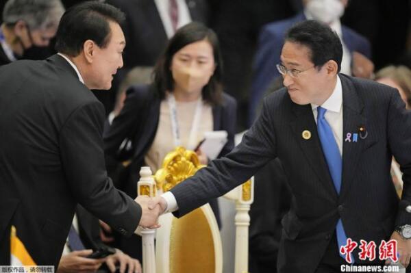 资料图:2022年11月,东盟峰会期间,日本首相岸田文雄(右)与韩国总统尹锡悦(左)握手。