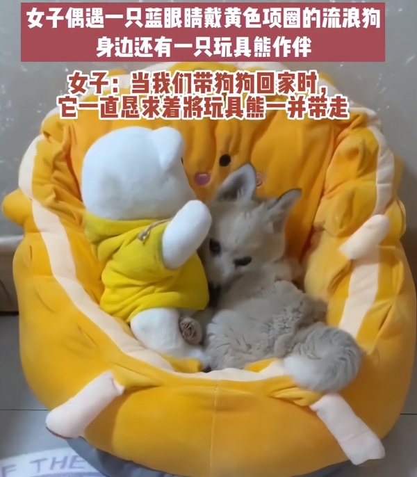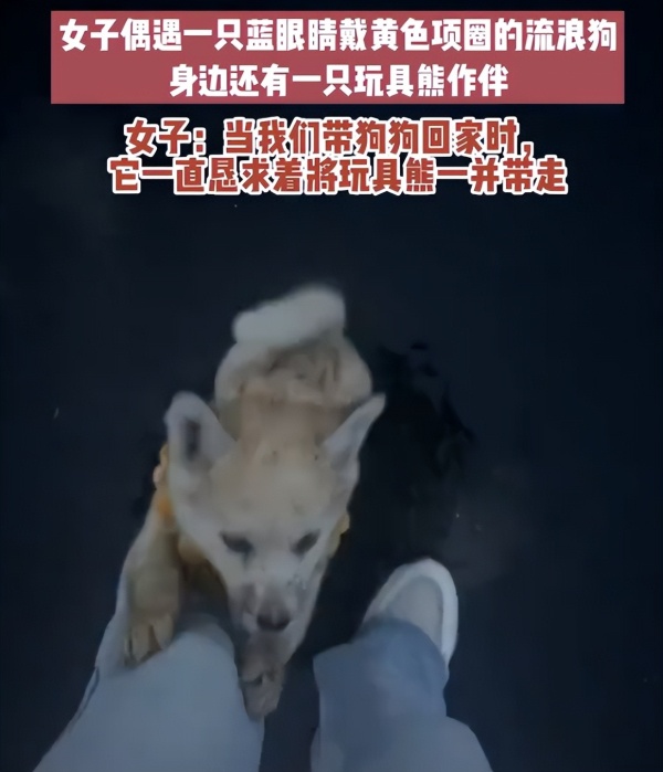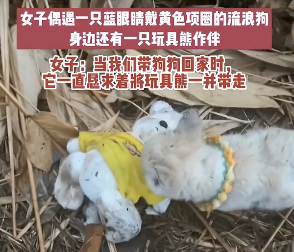 3月22日,根据都市时报报道,近日在山东济宁,女子偶遇一只蓝眼睛戴黄色项圈的流浪狗,想将它带走治疗时,小狗恳求其将玩具熊一并带走,引发广泛关注。