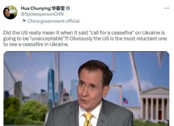 华春莹当日在推特上转发了柯比19日接受福克斯新闻采访时发表上述言论的视频。华春莹对此评论说,“美方称在乌克兰问题上‘呼吁停火’将是‘不可接受的’的,美国是认真的吗?显然,美国是最不愿意看到在乌克兰实现停火的一方”。