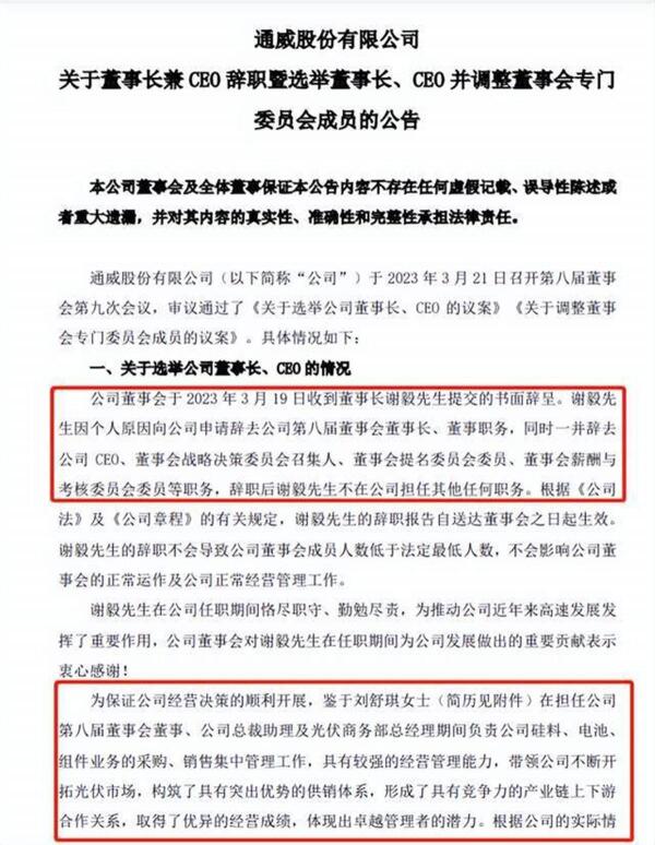 3月21日晚,通威股份发布公告称,公司董事会于3月19日收到董事长谢毅提交的书面辞呈。谢毅因个人原因向公司申请辞去公司第八届董事会董事长、董事职务,同时一并辞去公司CEO、董事会战略决策委员会召集人、董事会提名委员会委员、董事会薪酬与考核委员会委员等职务。辞职后谢毅不在公司担任其他任何职务。