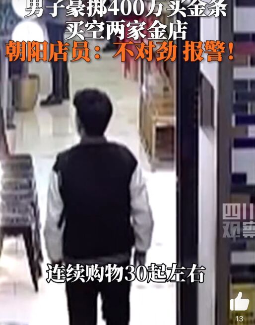 导读:近日,北京市朝阳区望京附近的两家金店来了一位“神秘豪客”,一出手就是四百万,一天时间,他光顾了金店10多次,把两家金店的所有金条都买走了。