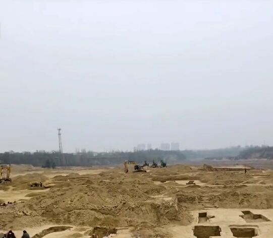 现场的视频显示,有文保部门人士带着施工工人,在一大片黄土地上正在开挖,显露出很多古代墓葬坑。