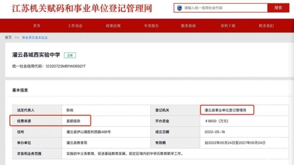 江苏机关赋码和事业单位登记管理网显示,民转公后,2022年5月18日,灌云高级中学城西分校初中部分改为灌云县城西实验学校,举办单位为灌云县教育局,且被灌云县事业单位登记管理局认定为差额拨款事业单位。“这也就意味着,灌云高级中学城西分校要从民办学校转为公立学校。”当地多名教育行业人士称。同时,多名2022级新生家长称,2022年7月报名时,连云港市新生入学预报名系统中,该校已归属公办学校一栏。