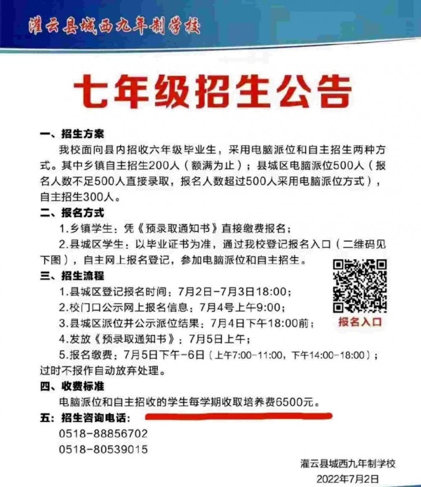 根据国家要求,义务教育全面纳入财政保障范围,公办义务教育学校不收取学费、杂费。就在灌云县高级中学城西分校转为公立学校后的2个月,该校却以灌云县城西九年制学校的名义发布了《七年级招生公告》,其中提到学校每学期收取培养费6500元。经上游新闻记者证实,灌云县城西九年制学校即为灌云县高级中学城西分校。