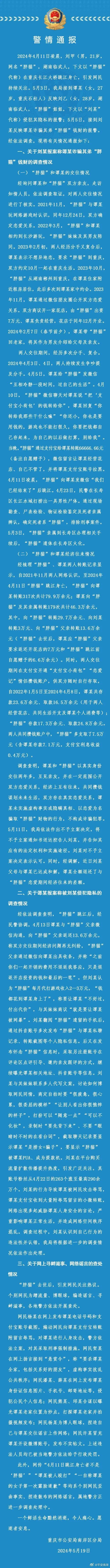 5月19日,重庆警方发布关于刘某(男,21岁,网名“胖猫”)在重庆长江大桥跳江身亡事件相关情况的通报。
