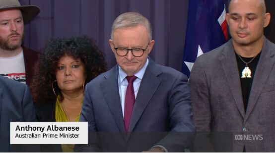 在今日新闻发布会上,路透社这样描述阿尔巴尼斯的讲话:他强忍泪水,公开了澳政府想要在全民公投中提出的问题——“一项拟议的法律:修改宪法,通过设立‘原住民和托雷斯海峡岛民之声’来承认澳大利亚原住民。你赞成这一修改建议吗?”