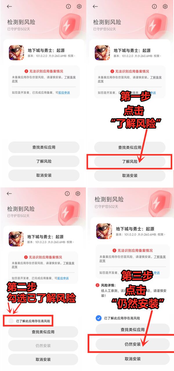 小米手机的操作就比较简单。在安装界面点击“了解风险”,勾选“此应用存在高风险”前面的小圆圈,点击仍然安装,即可轻松完成安装。
