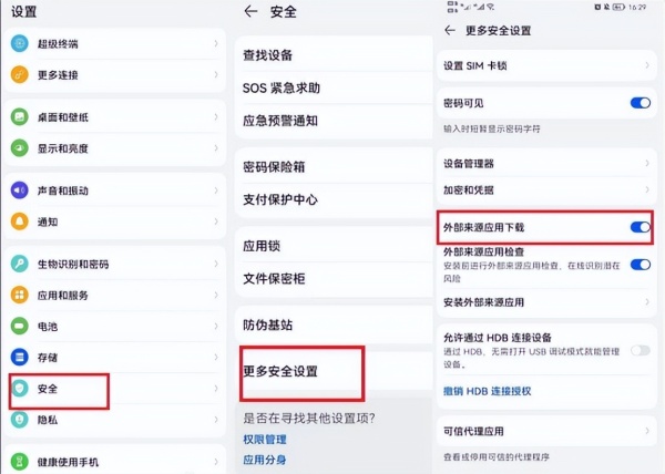 荣耀手机用户看这里,在手机设置界面找到“安全”选项并进入,最下方有一个“更多安全设置”,在“更多安全设置”中将“外部来源应用下载”按钮打开,即可设置成功。