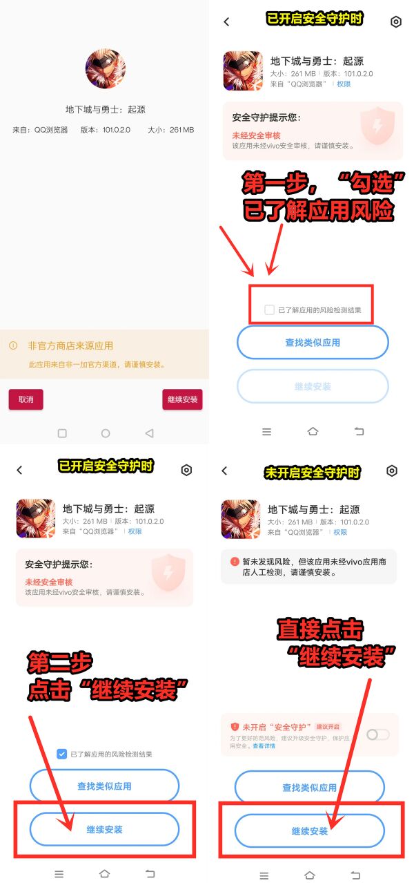 VIVO手机用户按照下面三部走,即可轻松完成设置。如果开启了安全守护,在安装界面勾选“以了解应用的风险检测结果”前面的方框,点击“继续安装”按钮即可,如果未开启安全守护,可以直接点击“继续安装”按钮,即可完成安装。