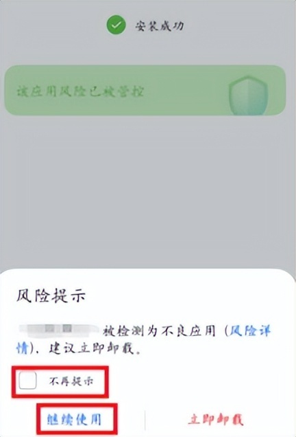 4,当安装成功后,弹出“此应用已被管控”的提示,勾选不再提示,并点击“继续使用”,即可完成安装。