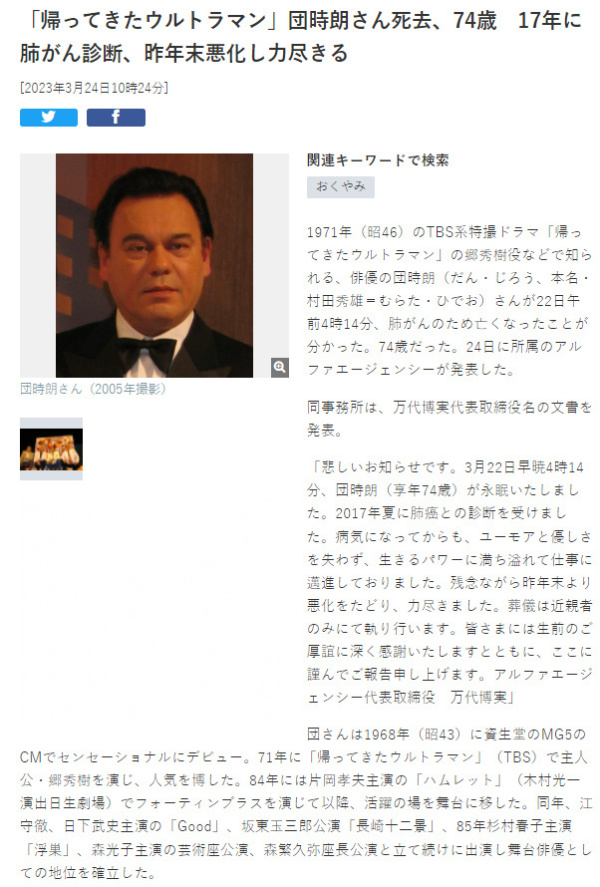 导读:近日消息,在《归来的奥特曼》中饰演乡秀树同时也是杰克奥特曼的团时朗去世,享年74岁。同时饰演雷欧奥特曼人间体的演员真夏龙也在推特证实了这个消息。