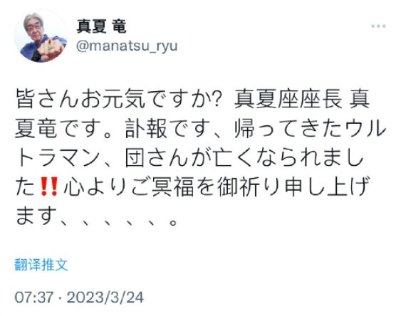 今日,《雷欧奥特曼》演员真夏龙发来讣告,在《归来的奥特曼》饰演杰克奥特曼人间体·乡秀树的团时朗去世。